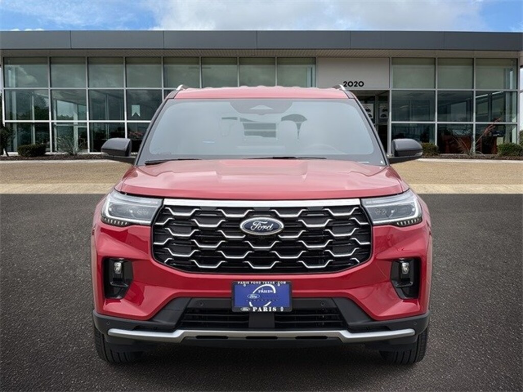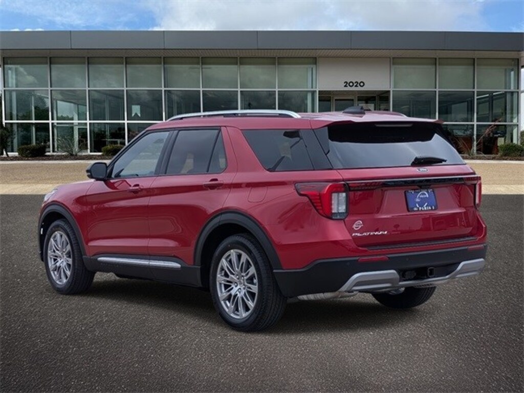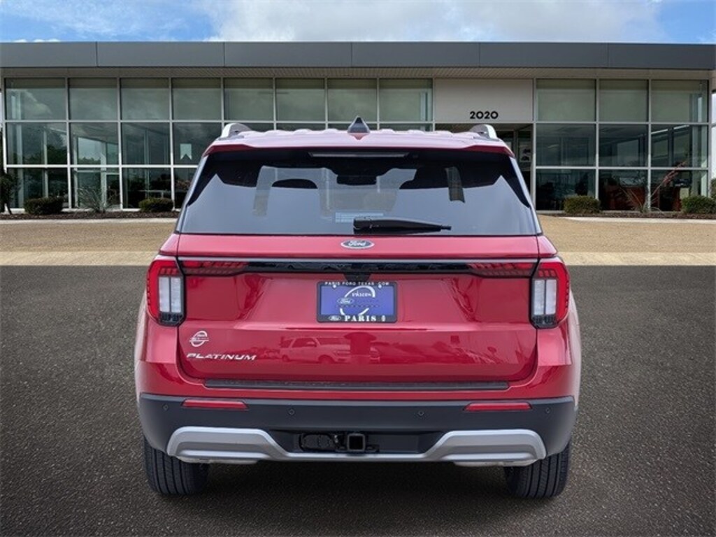 Rapid Red Metallic Tinted Clearcoat 2026 Ford Explorer Platinum RWD 10-Speed Automatic 2.3L EcoBoost I-4 14 Speakers, 3rd row seats: bench, 4-Wheel Disc Brakes, ABS brakes, ActiveX Trimmed Captain's Chairs, Air Conditioning, Alloy wheels, AM/FM radio: SiriusXM with 360L, Apple CarPlay/Android Auto, Auto High-beam Headlights, Auto-dimming door mirrors, Auto-dimming Rear-View mirror, Automatic temperature control, Brake assist, Bumpers: body-color, Compass, Delay-off headlights, Driver door bin, Driver vanity mirror, Dual front impact airbags, Dual front side impact airbags, Electronic Stability Control, Emergency communication system: 911 Assist, Exterior Parking Camera Rear, Four wheel independent suspension, Front anti-roll bar, Front Bucket Seats, Front Center Armrest, Front dual zone A/C, Front fog lights, Front reading lights, Fully automatic headlights, Garage door transmitter, Heated door mirrors, Heated front seats, Heated rear seats, Heated steering wheel, Illuminated entry, Internet access capable: FordPass Connect 5G, Knee airbag, Leather steering wheel, Low tire pressure warning, Memory seat, Navigation System, Occupant sensing airbag, Outside temperature display, Overhead airbag, Overhead console, Panic alarm, Passenger door bin, Passenger vanity mirror, Power door mirrors, Power driver seat, Power Liftgate, Power passenger seat, Power steering, Power windows, Radio data system, Radio: B&O Sound System by Bang & Olufsen with HD, Rain sensing wipers, Rear air conditioning, Rear anti-roll bar, Rear reading lights, Rear window defroster, Rear window wiper, Remote keyless entry, Security system, Speed control, Speed-sensing steering, Speed-Sensitive Wipers, Split folding rear seat, Spoiler, Steering wheel mounted audio controls, Tachometer, Telescoping steering wheel, Tilt steering wheel, Traction control, Trip computer, Turn signal indicator mirrors, Variably intermittent wipers, Ventilated front seats, and Wheels: 20" Luster Nickel-Painted Aluminum.